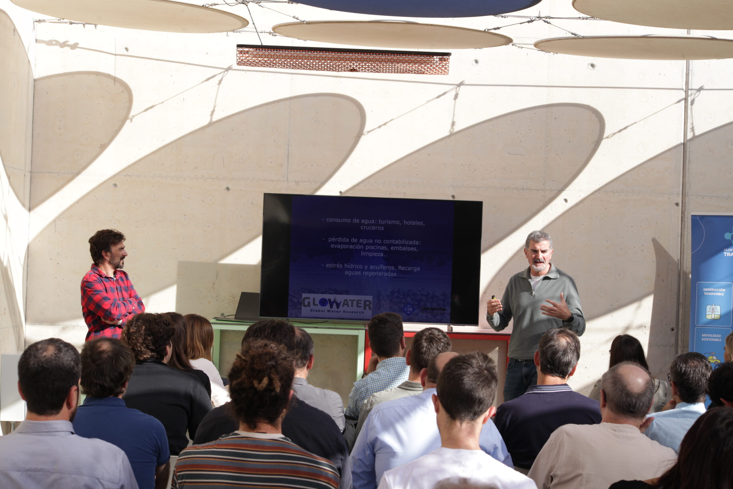 Por su parte, Celso García y Enrique Morán, del grupo Glowater (Global Water Research), abordaron los retos del consumo de agua en las Baleares, especialmente en el sector turístico, y presentaron estudios sobre evaporación, recarga de acuíferos y aprovechamiento de aguas regeneradas.