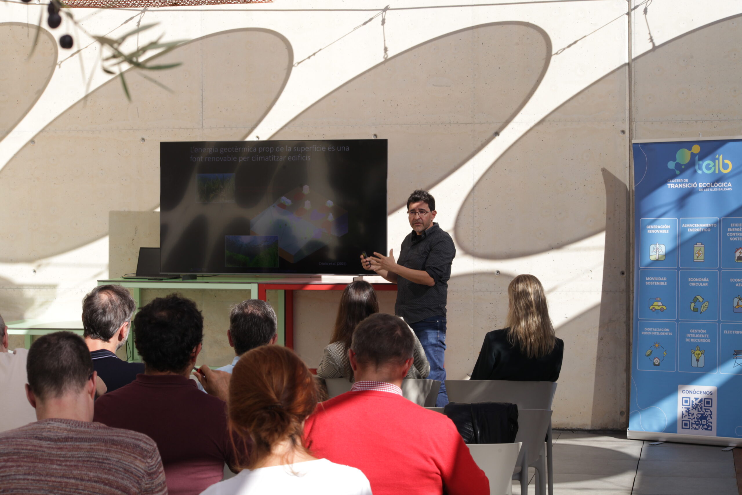 Joan Amengual, gerente de Clubio Energia, presentó la experiencia de su empresa en energías renovables y eficiencia energética, y destacó su interés por seguir colaborando con la universidad en soluciones de fitodepuración y autoconsumo.